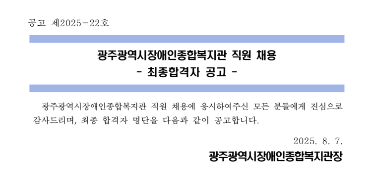 광주광역시장애인종합복지관 계약직 직원 1차 서류심사 결과 공고 |