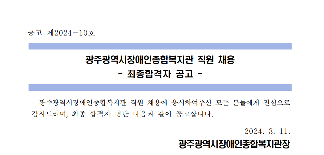 광주광역시장애인종합복지관 계약직 직원 1차 서류심사 결과 공고 |